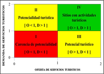 Para la valoración del potencial turístico, se aplicó una clasificación de potencialidades utilizando una escala de medición cuantitativa que osciló entre 0 y 1 ( Figura 1). Esta tabla de clasificación demostró su utilidad en la planificación y el desarrollo de estrategias turísticas de diversas maneras: