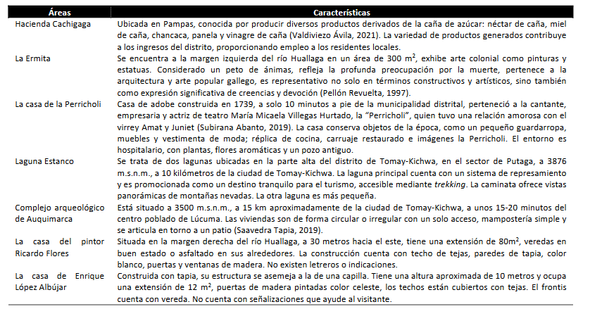 El distrito de Tomay-Kichwa, unidad de análisis de la presente investigación, se localizó en la provincia de Ambo, específicamente al suroeste de la ciudad de Huánuco, capital de la región homónima. Geográficamente, el distrito colindó al este con el distrito de Molinos, al oeste con el cauce del río Huallaga, al norte con el distrito de Conchamarca y al sur con el distrito de Ambo. La extensión territorial del distrito abarcó una superficie de 4,200 hectáreas, presentando una variación altitudinal considerable que osciló entre los 2,000 y los 4,300 metros sobre el nivel del mar (m s. n. m.) (Municipalidad Distrital de Tomay-Kichwa, 2002). Seguidamente, se presentan las principales áreas de interés turístico identificadas en el distrito (Tabla 1).