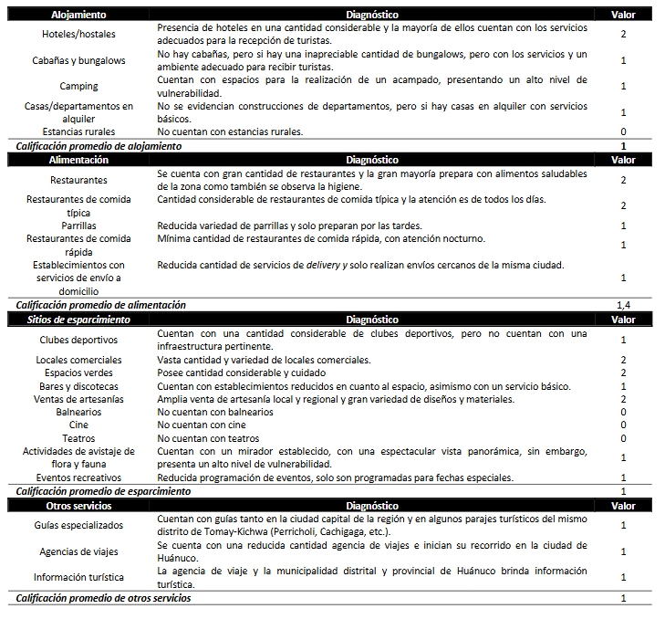 En cuanto a infraestructura turística, Tomay-Kichwa cuenta con una oferta de alojamiento en hoteles y hostales que, aunque no son de categoría cuatro o cinco estrellas, pueden satisfacer las necesidades de los visitantes. No hay disponibilidad de casas ni departamentos en alquiler, pero sí una amplia variedad de establecimientos gastronómicos. las agencias de viaje, así como la municipalidad distrital y la municipalidad provincial de Ambo, presentan algunas deficiencias en la provisión de información turística. Se estimó la evaluación de equipamiento y servicios turísticos(1,3 puntos) (Tabla 4).