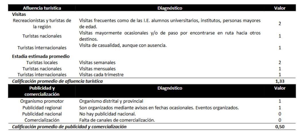 En lo referente a la publicidad y comercialización, se constató que la promoción se limita principalmente a los niveles distrital y provincial, con anuncios esporádicos asociados a eventos específicos, sin alcanzar una difusión a nivel nacional. Adicionalmente, se identificaron obstáculos en la comercialización debido a la ausencia de canales adecuados para la difusión y venta de servicios turísticos.