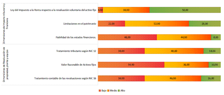 La Figura 1 representa las percepciones respecto al impacto de la revaluación de activos fijos en distintas dimensiones contables y tributarias. El componente tributario evidencia la mayor sensibilidad institucional: el 58 % de los encuestados identifica que la “Ley del Impuesto a la Renta frente a revaluaciones voluntarias” tiene un impacto “Alto”, lo que reafirma su rol como principal fuente de fricción normativa. En contraste, las “Limitaciones patrimoniales” se concentran en el nivel “Medio” (52 %), señalando una afectación moderada pero persistente en la capacidad de capitalización y gestión financiera. La “Fiabilidad de los estados financieros”, por su parte, refleja un predominio de respuestas en el nivel “Bajo” (48 %), lo cual sugiere que las revaluaciones no siempre aportan mejoras sustanciales a la transparencia contable o enfrentan obstáculos técnicos y normativos para lograrlo.