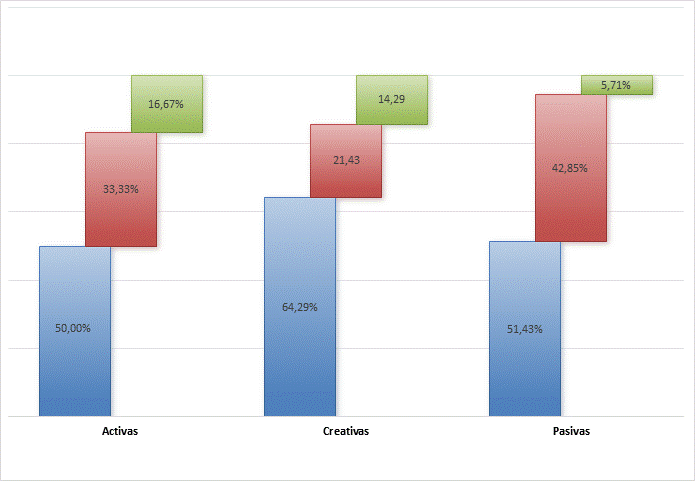 En la figura 1, se representan las tres dimensiones consideradas en esta investigación, estrategias activas, creativas y pasivas. Las cuales son expresadas en porcentaje e indica como los docentes esas estrategias. Para las estrategias activa, se observa fuerte inclinación hacia el uso frecuente de estrategias activas, con la mitad de los docentes aplicándolas "siempre" y una proporción significativa (un tercio) "casi siempre". Esto sugiere que la mayoría de los docentes en esta asignatura favorecen un enfoque donde los estudiantes participan activamente en su aprendizaje. En cuanto a la dimensión estrategias creativas el 64,29 % de los docentes siempre las utilizan y solo 14,29 % de los docentes las utilizan a veces. Finalmente, las estrategias pasivas los docentes refieren usarlas siempre y casi siempre en 51,43 % y 42,85% respectivamente. Lo que sugiere que, a pesar de la intención constructivista, aún hay una dependencia significativa en métodos de enseñanza más tradicionales, como conferencias o lectura, donde el estudiante es un receptor de información.