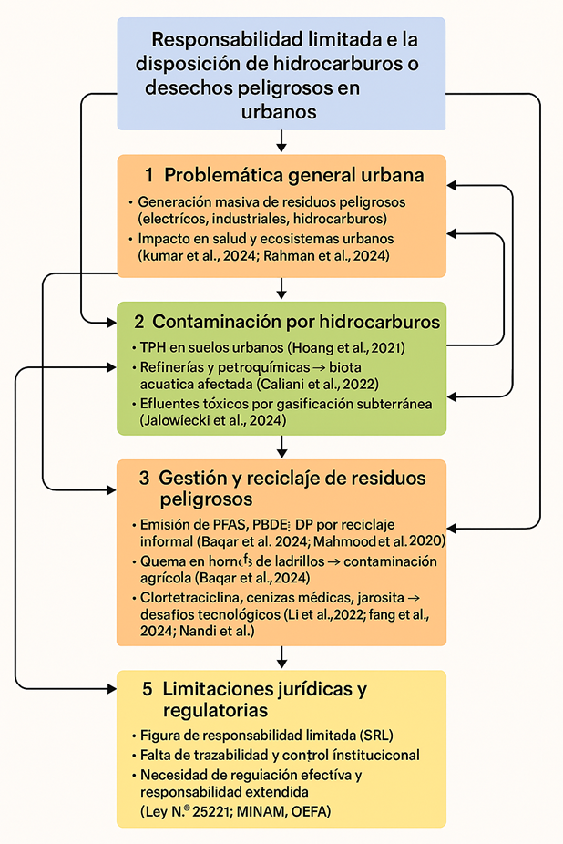 Global urbanization has intensified the generation of hazardous waste and hydrocarbons, posing a growing threat to public health and urban ecosystems, particularly in developing countries. In Peru, despite a robust legal framework that establishes the comprehensive responsibility of the generator and prohibits the improper disposal of these wastes, its effective application faces obstacles. One of the main tensions lies in the dual interpretation of “limited liability”: while environmental law dictates continuous and non-transferable responsibility, in the commercial sphere, Limited Liability Companies (SRLs) do not compromise the personal assets of their partners. This duality, coupled with limited oversight, scarce municipal infrastructure, and weak coordination among MINAM, OEFA, and local governments, creates gaps in the application of sanctions and weakens accountability. This study, employing an analytical-descriptive approach and a comparative documentary design, analyzed Peruvian laws and 18 recent scientific studies. The findings were organized into five thematic clusters: urban problematic, hydrocarbon contamination, management and recycling, sustainable solutions, and legal limitations. The analysis revealed a critical gap between regulations and their implementation. “Hydrocarbon Problematic” showed a direct causal relationship; “Management Problematic,” a structural-functional relationship; “Management Solutions,” an adaptive response; and “Legal Limitations,” a transversal relationship of maximum influence. It is concluded that it is urgent to strengthen oversight, clarify competencies, and improve infrastructure to achieve sustainable hazardous waste management in urban environments.