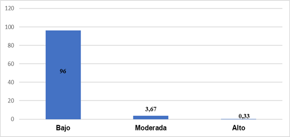 Según los datos presentados en la figura 3, el 96,00 % de los encuestados se ubica en un nivel bajo, el 3,67 % en un nivel medio y solo el 0,33 % en un nivel alto. Estos resultados permiten concluir que la motivación hacia la lectura, en la mayoría de los estudiantes, se encuentra en un nivel bajo.
