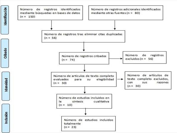 El proceso de selección siguió los pasos establecidos por PRISMA, se recopilaron un total inicial de 230 artículos a través de las bases de datos mencionadas. De la misma forma, tras la aplicación de los criterios de inclusión y exclusión, se eliminaron 100 artículos por no cumplir con los requisitos establecidos. En la revisión, de los 130 artículos restantes, se realizó una revisión detallada del contenido, lo que resultó en la inclusión final de 23 estudios relevantes para el análisis.