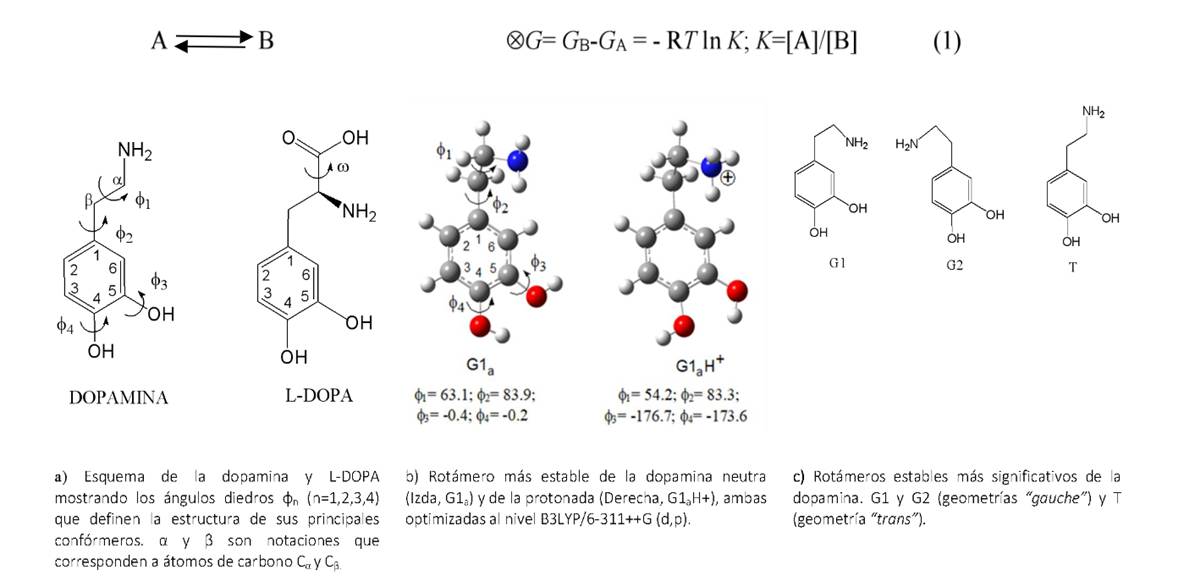 En la Figura 1 sección “a”, se muestra el esquema conformacional de la dopamina y su precursor L-DOPA, generados por rotaciones de los grupos aromático, NH2, OH o COOH (en caso de la L-DOPA). Tras una considerable cantidad de rotámeros, varios de ellos con estructuras enantioméricas, generados principalmente por rotaciones alrededor de los enlaces C−N y C−C. Ahora bien, esta variabilidad conformacional, es definida por los ángulos diedros φn (n=1,2,3,4), así φ1 (∠C1CβCαN) describe la rotación del grupo metil-amino; φ2 (∠C2C1CβCα) la rotación del grupo aromático difenólico (catecol); φ3 (∠C6C5OH) y φ4 (∠C5C4OH) rotación de los OH del grupo aromático. En el caso de la L-DOPA la rotación de su grupo ácido viene descrito por el ángulo diedro ω (∠CβCαC=O).