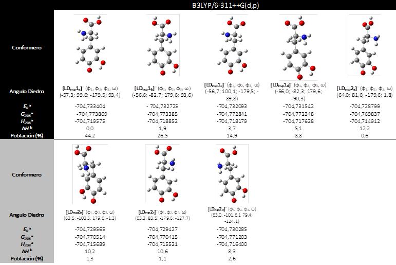 En la Tabla 3 se muestran los parámetros energéticos de las geometrías estables más significativas de la L-DOPA, obtenidos tanto a niveles B3LYP/6-311++G(d,p) como a G3. El tamaño de la molécula ha sido uno de los limitantes que nos impidió realizar cálculos al nivel G4.