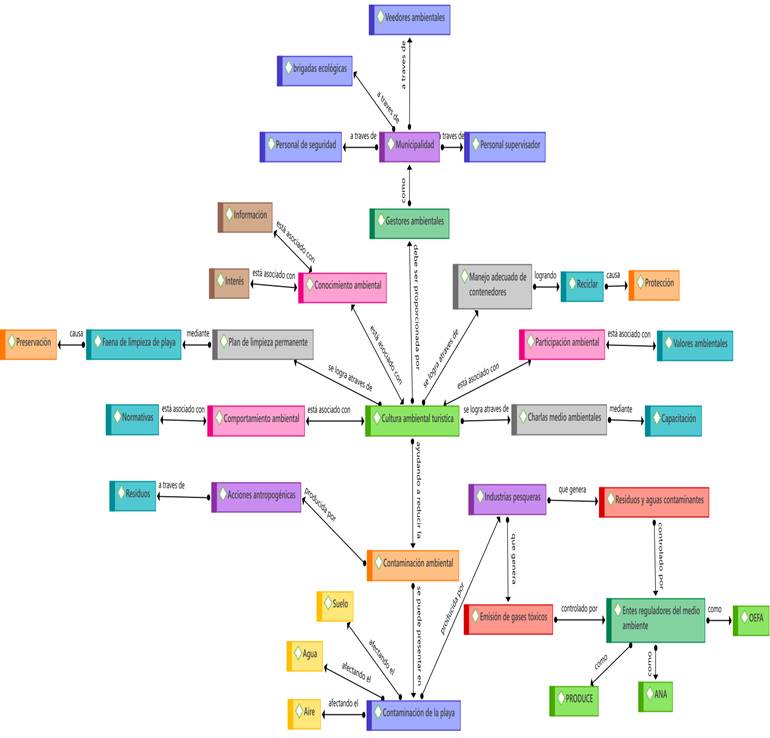 La Figura 2 presenta un mapa conceptual que sintetiza los actores, procesos y problemáticas involucradas en la gestión ambiental de zonas turísticas costeras. En el núcleo del esquema se ubica la municipalidad, en interacción directa con brigadas ecológicas, personal supervisor, gestores ambientales y cuerpos de seguridad, quienes desempeñan funciones operativas clave. El mapa destaca elementos como el conocimiento ambiental, el manejo adecuado de residuos, el reciclaje y la participación social, todos ellos integrados en una cultura ambiental turística que promueve normas de limpieza permanente y comportamientos responsables.