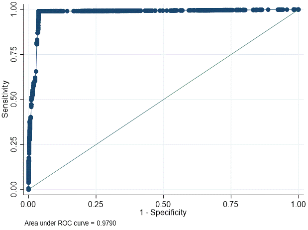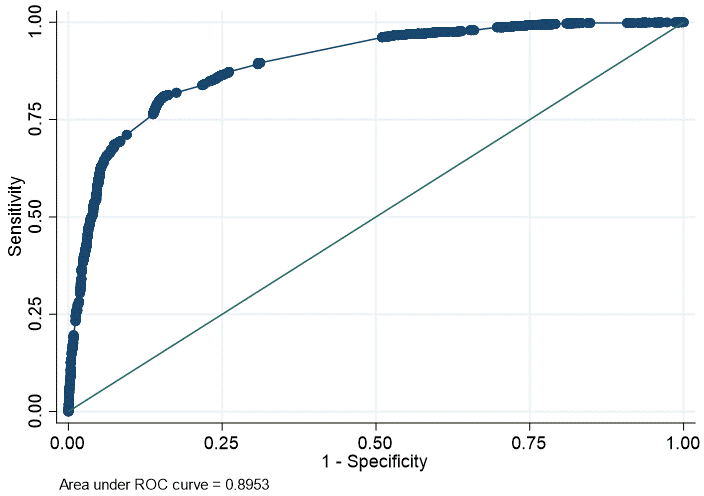 El área bajo la curva ROC (AUC) obtenida en el segundo modelo fue de 0,8953 (Figura 2), lo que evidencia un poder predictivo elevado. Este resultado indica que el modelo tiene una capacidad del 89,53 % para clasificar de manera correcta a los hogares conectados y no conectados a la red de desagüe. En términos metodológicos, un AUC comprendido entre 0,8 y 0,9 se considera indicativo de una alta capacidad de discriminación, lo que confirma que las variables explicativas seleccionadas predicen de forma efectiva la probabilidad de conexión a los servicios de saneamiento. Si bien el valor es ligeramente inferior al alcanzado en el primer modelo (0,970), se mantiene dentro de un rango sólido y confiable, lo que respalda la validez del ajuste. Además, el hecho de no alcanzar un AUC cercano a 1,0 sugiere que el segundo modelo podría ser más generalizable y menos propenso al sobreajuste frente a nuevos conjuntos de datos.