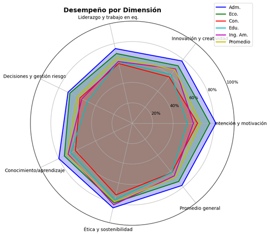 En la Tabla 2 y Figura 1 se observa que, el promedio general de los encuestados es medio-alto (68%), con fortalezas en ética y sostenibilidad (79%) y conocimiento y aprendizaje (71%), pero debilidades en gestión del riesgo (60%) y liderazgo (66%); asimismo, se observa que Administración (78%) y Economía (73%) presentan los perfiles emprendedores más sólidos, mientras que Contabilidad (62%) y Educación mención Ciencias Sociales (62%) evidencian menor motivación y dificultad para asumir riesgos, lo que indica que aunque existe potencial emprendedor en la muestra, aún se requiere fortalecer competencias prácticas y estratégicas para un desarrollo más integral.