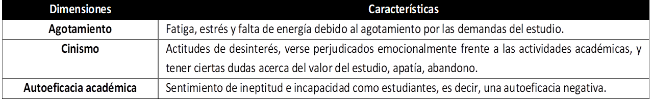 En la Tabla 1 se resumen las características de cada dimensión del síndrome de burnout académico.