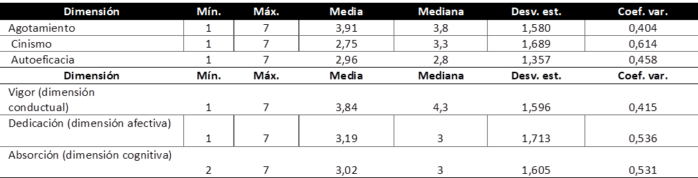 Los alumnos universitarios en general mantienen niveles medios bajos de burnout, el agotamiento es la dimensión un poco más elevada, es decir, los alumnos manifiestan medianamente fatiga, estrés y falta de energía debido al agotamiento de los recursos emocionales. Por su parte, el promedio de engagement fue observado con niveles medianos, resaltando la vigorosidad, es decir, niveles medios de energía y resiliencia mental mientras se estudia, y por el deseo de esforzarse en el trabajo académico.