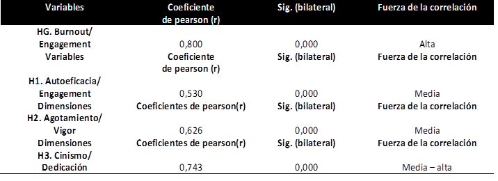 Para poder comprobar las hipótesis de trabajo entre las dimensiones de burnout y engagement se llevó a cabo el análisis de correlación Pearson. En la Tabla 4 se presenta el coeficiente de correlación de la hipótesis general. Se observa una correlación estadísticamente significativa positiva alta, lo que permite probar la HG. Existe relación positiva entre el burnout y el engagement en los estudiantes universitarios.