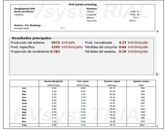Adicionalmente, el software suministró datos críticos sobre la potencia nominal de generación, lo que facilita la comprensión de la capacidad instalada y la eficiencia del sistema bajo diversas condiciones de carga (Figura 2 c). Estos indicadores de rendimiento permiten evaluar de manera integral la producción diaria de la planta simulada, verificando el cumplimiento de los objetivos de suministro y distribución energética previstos para la institución educativa. En suma, la simulación arroja una visión completa de la resiliencia del sistema, permitiendo validar la viabilidad técnica de la infraestructura propuesta.