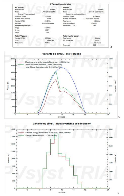 Figura. 2. Parámetros y resultados del modelado fotovoltaico: a) Especificaciones técnicas del arreglo de módulos e inversor; b) Comportamiento de la potencia e irradiación en un ciclo diario; c) Balance de energía generada e inyectada a la red eléctrica