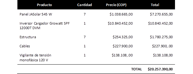 Fase IV: Evaluación económica y financiera. Se consolidó un presupuesto detallado, que integra los costos de adquisición de tecnología frente a los ahorros proyectados en la facturación del servicio eléctrico público.