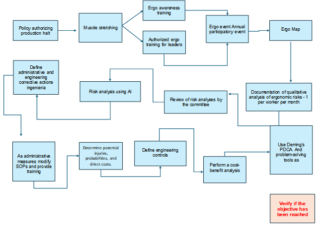 The research is aimed at the design, implementation, and validation of a comprehensive methodology called the Business Plan Ergonomic Safety Program (BPESP), whose purpose is to transform ergonomic management into industrial environments from a reactive and fragmented practice to an operational, participatory, and legally supported strategy. The methodological approach adopted is mixed, with a qualitative predominance in the diagnosis and design phase, and quantitative in the impact validation phase. The methodology is structured in five sequential and interdependent phases, which allow ergonomic gaps to be addressed from a systemic perspective.