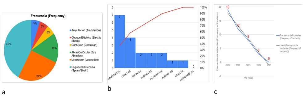 Figure 2 illustrates a marked reduction in the Incidence Rate of Musculoskeletal Disorders (MSDs) in pilot plants when comparing the period before the implementation of BPESP with the 60 months after. The pattern of injuries shows that sprains and strains constitute 42% of the total, positioning itself as the main indicator of ergonomic risk (Section a). This risk, far from being evenly distributed, is geographically concentrated: more than 50% of cases come exclusively from Lakeland (FL) and Chino (CA) campuses, revealing critical sources of exposure (Section b). However, the strategic intervention has been forceful: ergonomic incidents fell from 19 in 2021 to just 3 in 2024, representing a decrease of more than 84%, validating the effectiveness of the preventive approach adopted (Section c).