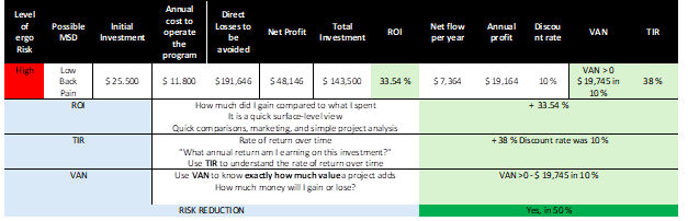 Table 2. Financial evaluation of ergonomic interventions: ROI, NPV, and IRR at high risk of low back injury