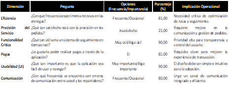 La encuesta validó cuantitativamente los hallazgos de las entrevistas, destacando la necesidad urgente de optimización logística. La Tabla 1 presenta la síntesis de los resultados clave de la encuesta, enfocada en la eficiencia del sistema actual, la utilidad de las funcionalidades propuestas y la usabilidad.