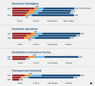 Para la dimensión de la toma de decisiones. Se muestra que todas las dimensiones se ubican en niveles bajos, destacando particularmente la transparencia decisional, que alcanza un nivel muy bajo (M = 1,98; DE = 0,68). Asimismo, el uso de información técnica registra un promedio reducido (M = 2,05; DE = 0,61), lo que sugiere debilidades en la incorporación de criterios técnicos y evidencia empírica en los procesos decisionales. Las decisiones estratégicas (M = 2,18; DE = 0,64) y la participación en la toma de decisiones (M = 2,31; DE = 0,66) también presentan niveles bajos, evidenciando una gestión con limitada planificación de largo plazo y escasa inclusión de actores organizacionales. Estos elementos revelan una estructura decisional frágil, caracterizada por prácticas poco sistemáticas y reducida transparencia institucional.