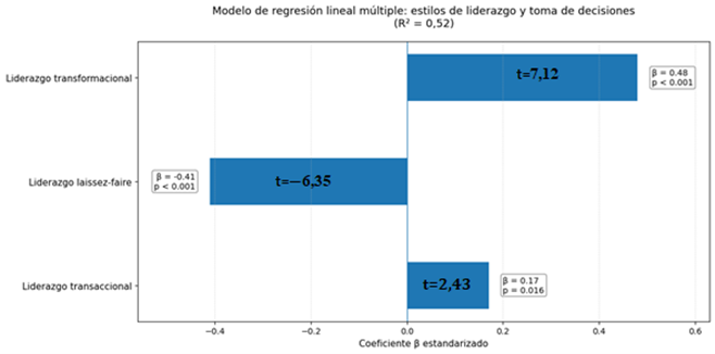 La Figura 2 presenta los resultados del modelo de regresión lineal múltiple, donde los estilos de liderazgo explican el 52 % de la variabilidad de la toma de decisiones (R² = 0,52), evidenciando un alto grado explicativo. El liderazgo transformacional emerge como el predictor positivo más relevante (β = 0,48; p < 0,001), seguido del liderazgo transaccional (β = 0,17; p = 0,016). En contraste, el liderazgo laissez-faire muestra un efecto negativo significativo (β = −0,41; p < 0,001), confirmando su impacto adverso en la calidad de los procesos decisionales. En este sentido, los resultados señalan que la predominancia de estilos de liderazgo pasivos limita significativamente la toma de decisiones en la gestión municipal, mientras que la adopción de enfoques transformacionales se asocia con mejoras sustantivas en la eficiencia, racionalidad y transparencia.