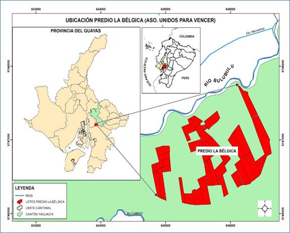 El proyecto se localiza en la provincia de Guayas, cantón San Jacinto de Yaguachi, parroquia Virgen de Fátima, a una altitud promedio de 13 m.s.n.m. y cuyas coordenadas UTM son X: 645373 y Y: 9746433/ Huso 17 / Zona Sur / Datum: WGS84. El predio “La Bélgica” limita: al norte con el Rio Bulubulu, y al sur se encuentra a 290 metros aproximadamente, del Río Culebras. A continuación, en la Figura 1, se presenta la ubicación del predio “La Bélgica”, que proporciona el contexto geográfico y la proximidad a la fuente hídrica.