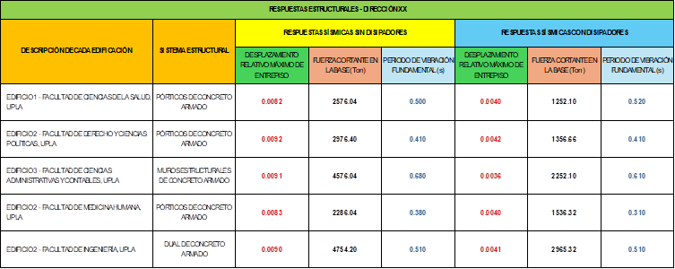 Tabla 3. Comparación de las respuestas estructurales para cada edificio en la dirección XX