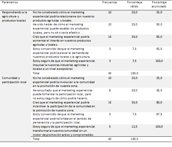 De los cinco elementos expuestos en la encuesta donde cada uno de estos lo integraban cinco opciones los resultados más representativos que fueron la manifestación de la agricultura y productos locales y como se manifiesta la comunidad y participación local respecto al marketing experiencial para la promoción de la mancomunidad de San Vicente se exponen a continuación en la tabla 4.